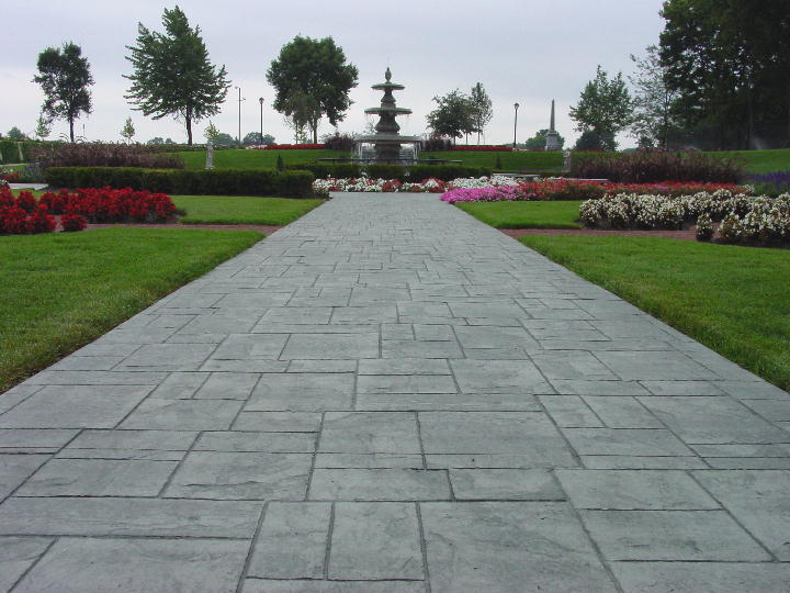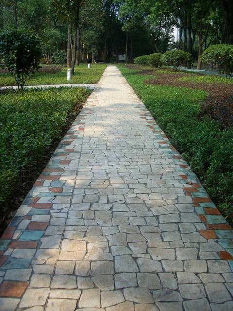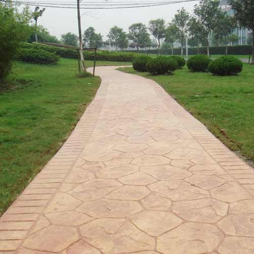 壓模前要事先研究并制訂成型模排列及提放的位置及方向,確保圖案的整體性。將第一塊成型模沿著放樣圖案參照線鋪設(shè),并將其垂直壓進(jìn)混凝土內(nèi)。施工者可以站立在成型模上,人體自身重量足以使成型模能在混凝土表層形成紋理,必要時(shí)可以使用明建成型模專用搗棒把成型模垂直地壓進(jìn)施工面內(nèi),以更好地壓出清楚逼真的圖案。掌握壓模的時(shí)間非常重要,太濕或太干的混凝土表面都會(huì)影響最后的圖案及效。